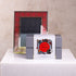 Our Dubai Frame is electroplated with pure silver filigree and intricately laser cut.  The vibrant pop of red is a handmade insert using Indian raw silk dupion fabric,  our stands are made with luxury wallpaper and as a finishing touch we chose evil eye details to protect your most precious moments. We promise elegance in every detail.